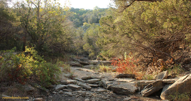 We hiked a half-mile stretch of the Cedar Brake Outer Loop trail that crossed the Paluxy River and proceeded north along the dry bank to the Denio Creek trail and Primitive Camping area. Outside of a few areas of standing water, Denio Creek was as dry as the Paluxy.